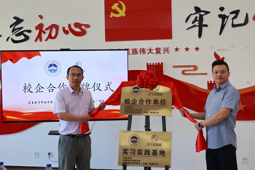 隨后,揭牌儀式正式啟動。在雙方代表共同見證下,機(jī)電工程學(xué)院院長石廣豐與睿驕科技信息服務(wù)有限公司董事長施睿哲共同完成揭牌,為長春電子科技學(xué)院授予“校企合作單位”牌匾,同時為睿驕科技信息服務(wù)有限公司授予“實(shí)習(xí)實(shí)踐基地”牌匾。