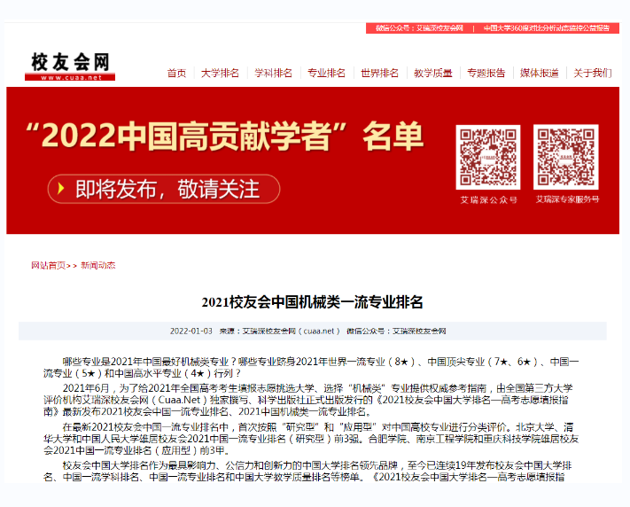 按照2022年艾瑞深校友會網(wǎng)最新公布的2021校友會中國機(jī)械類一流專業(yè)排名中:機(jī)械設(shè)計(jì)制造及其自動化專業(yè)躋身2021中國一流專業(yè)排名(應(yīng)用型)6星級,中國頂尖應(yīng)用型專業(yè)。