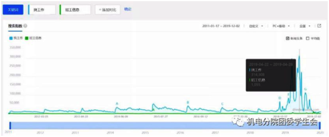 根據(jù)百度指數(shù),通過百度搜索“找工作”關(guān)鍵字的次數(shù),在2019年,跟過去十年相比,增長了10倍,如下圖所示:
