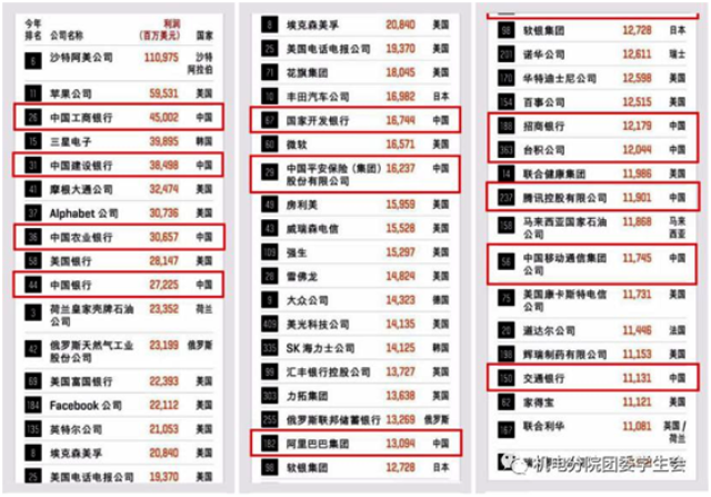 可以看到,在全世界最賺錢的50個(gè)公司中,中國公司上榜的有12個(gè),其中 7 個(gè)是銀行,在中國最賺錢的前五個(gè)公司中,全部都是銀行業(yè)。這意味著,在當(dāng)下的中國,只有銀行是最賺錢的,其他行業(yè)賺錢能力都下滑了,連榜單中最弱的交通銀行的賺錢能力都超過了華為、小米等高科技公司。