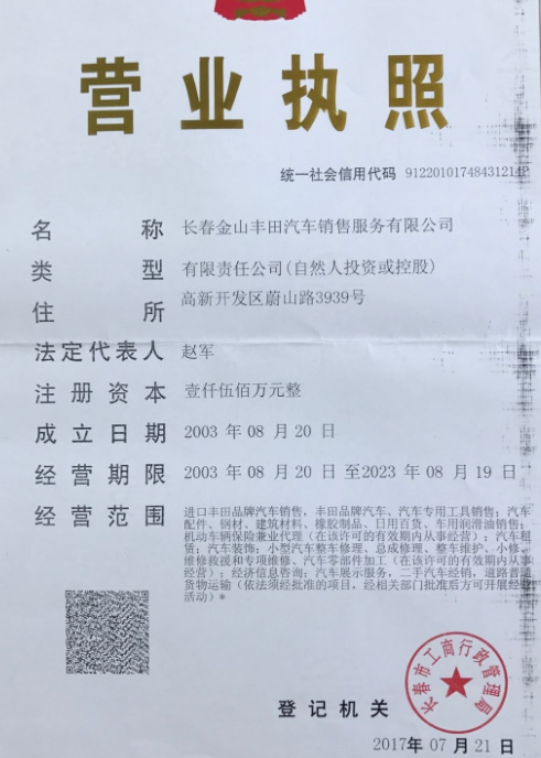 | 單位名稱 | 長春金山豐田汽車銷售服務(wù)有限公司 | ||||