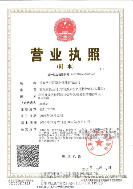 | 單位名稱 | 長(zhǎng)春活力匯商業(yè)管理有限公司 | ||||