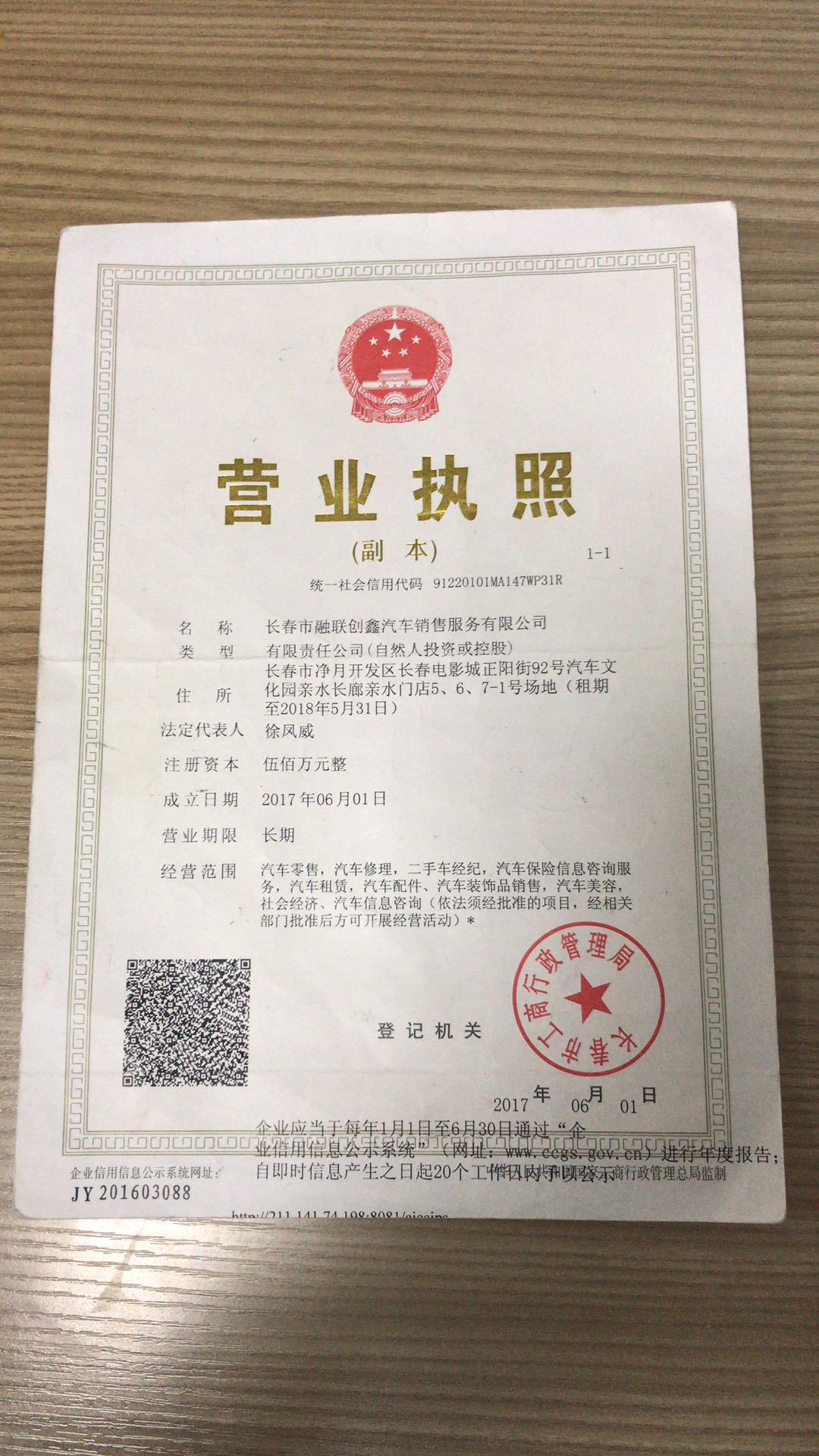 | 單位名稱 | 長(zhǎng)春市融聯(lián)創(chuàng)鑫汽車銷售服務(wù)有限公司 | ||||