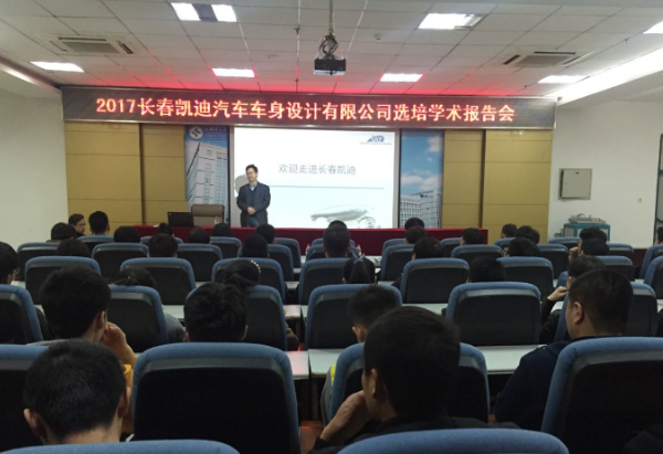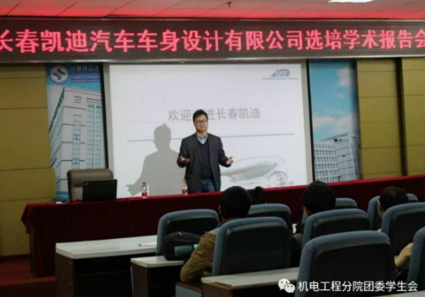 3月29日下午1:30分 主教14樓會(huì)議室,長(zhǎng)春凱迪汽車車身設(shè)計(jì)有限公司選培學(xué)術(shù)報(bào)告會(huì)。出席報(bào)告會(huì)的有總經(jīng)理盧金火先生,項(xiàng)目部部長(zhǎng)申瑞成先生,培訓(xùn)室經(jīng)理劉會(huì)經(jīng)理,經(jīng)理助理徐碩女士及人事李丹女士。機(jī)電分院14級(jí)學(xué)生參加了此次報(bào)告會(huì)。