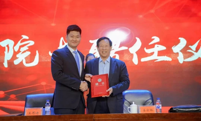 聘任儀式上,學(xué)院董事長(zhǎng)、院長(zhǎng)王思迪親自將名譽(yù)院長(zhǎng)聘書(shū)頒發(fā)給姜會(huì)林院士,并合影留念。