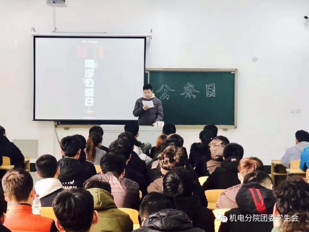 12月13日,國(guó)家公祭日。上午十點(diǎn)由張翰文老師組織大一學(xué)生,李秀峰老師、張永祥老師、趙寶剛老師組織大二學(xué)生在1號(hào)樓舉行默哀活動(dòng),悼念南京大屠殺死難者和所有在日本帝國(guó)主義侵華戰(zhàn)爭(zhēng)期間慘遭日本侵略者殺戮的死難者,引導(dǎo)學(xué)生牢記歷史,鼓勵(lì)學(xué)生爭(zhēng)做時(shí)代的奮進(jìn)者、搏擊者,為實(shí)現(xiàn)中華民族偉大復(fù)興的中國(guó)夢(mèng)而不懈奮斗。