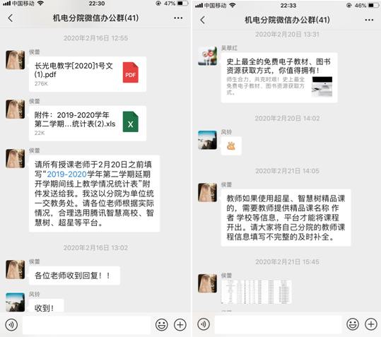 (2)通過分院QQ群和微信群每日發(fā)布教學相關信息,及時將學校和分院的相關通知傳達給各位老師,如在線教學的經(jīng)驗分享推送、教職工線上培訓方案、吉林省普通本科高校線上教學案例等。