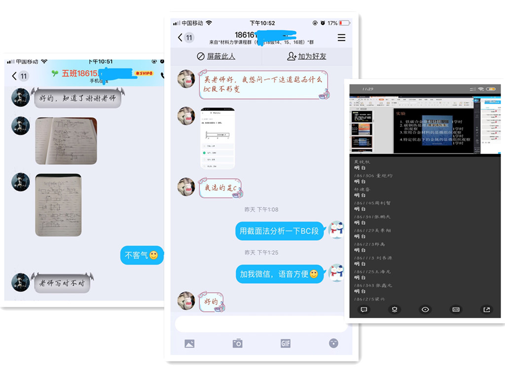 2、采用智慧樹平臺上的精品課進行教學,同時利用QQ共享屏幕通過PPT直播授課,軟件使用順暢,并無卡頓、掉線等情況發(fā)生。通過QQ群講授課程,學生結(jié)合智慧樹上老師發(fā)布的相關視頻,完成本次課程的學習任務。學生通過QQ群隨時回答問題,提出疑問,實現(xiàn)與老師互動。通過智慧樹平臺可以完成作業(yè)及測試,實現(xiàn)知識點鞏固和檢驗。