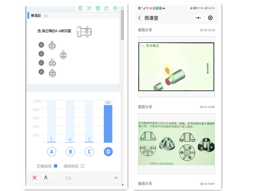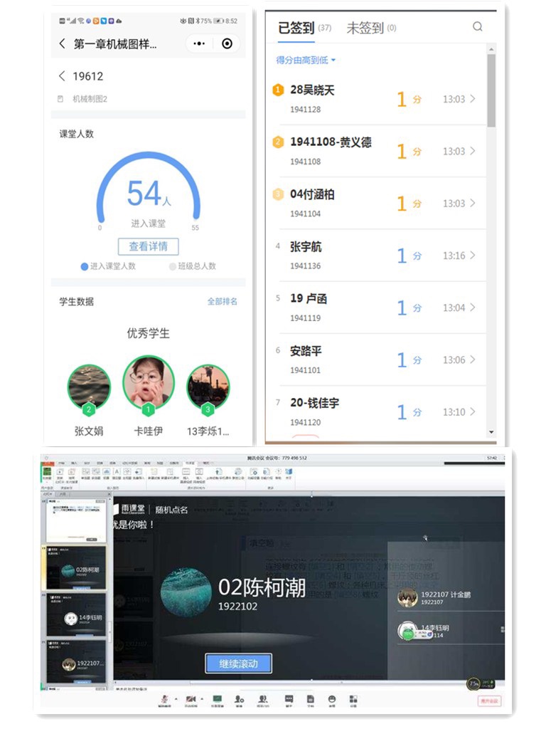 經(jīng)過精心的備課和三周的線上教學(xué),取得良好的效果。在教學(xué)過程中利用騰訊會(huì)議進(jìn)行直播,利用投屏講解知識(shí)點(diǎn)以及教學(xué)難點(diǎn),利用雨課堂進(jìn)行翻轉(zhuǎn)課堂,將教學(xué)全過程進(jìn)行記錄。利用群發(fā)公告發(fā)布學(xué)生需要預(yù)習(xí)的視頻以及下次課要完成的任務(wù)項(xiàng)目,并推送作業(yè)題目。課上充分利用彈幕組織討論,師生積極互動(dòng)。利用單選題、多選題限時(shí)測試,進(jìn)行隨堂知識(shí)檢測,結(jié)果實(shí)時(shí)統(tǒng)計(jì)展示給學(xué)生。利用雨課堂教學(xué),學(xué)生不再拍照抄寫,專注聽課思考。