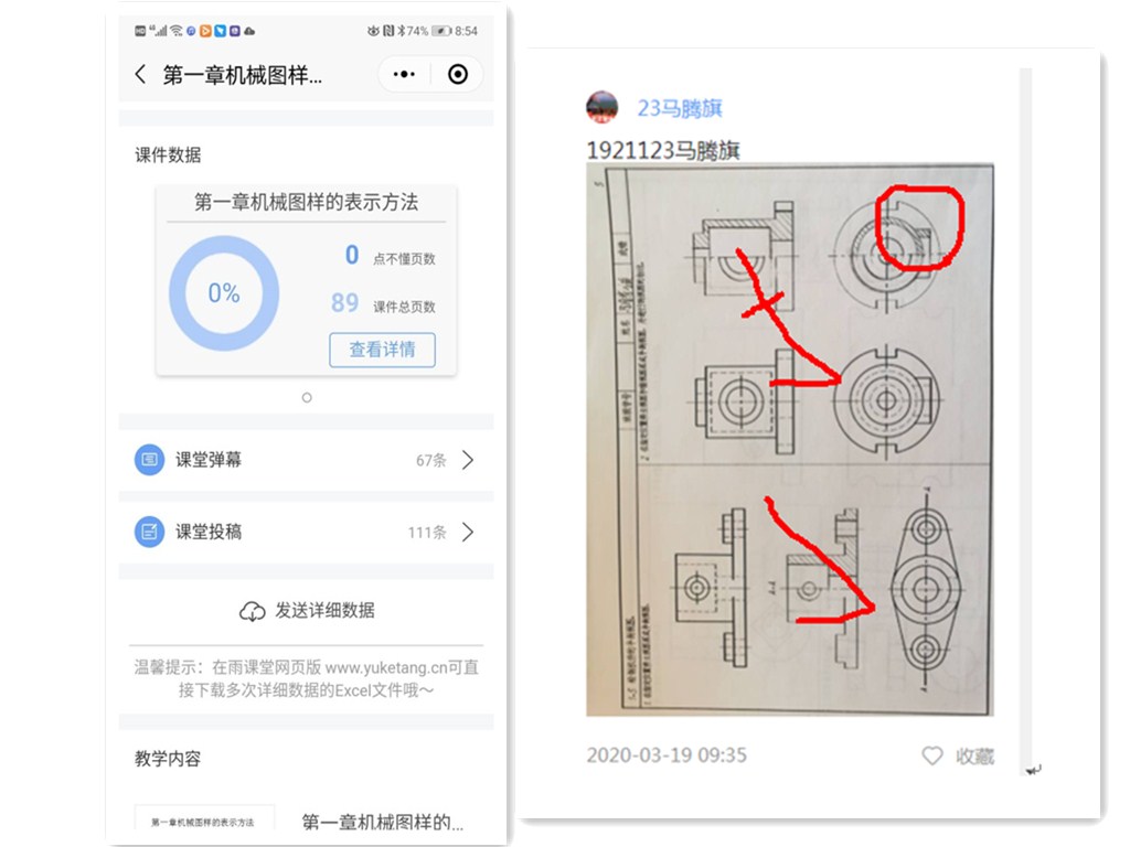 學(xué)生學(xué)習(xí)遇到困難及時(shí)利用彈幕反饋,師生隨時(shí)溝通。上課收作業(yè)利用雨課堂投稿形式,學(xué)生做完作業(yè)拍下圖片上交,教師進(jìn)行批閱,作業(yè)完成情況良好。