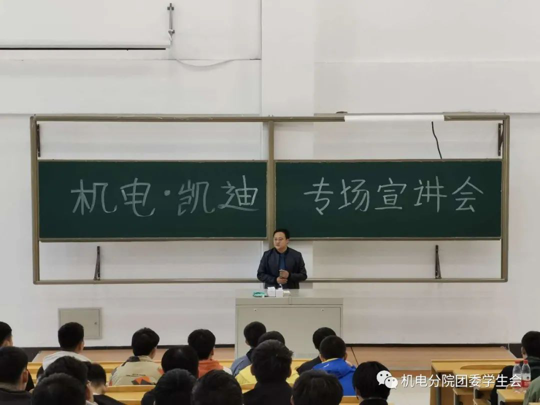“校企合作共雙贏,定向培養(yǎng)話創(chuàng)新”。為響應(yīng)國家關(guān)于加強學校和企業(yè)合作的號召,充分發(fā)揮出學校與企業(yè)的雙方優(yōu)勢,同時也為大學生實習、實訓、就業(yè)提供更多空間,機電工程學院于2020年10月28日召開凱迪集團與我院的校企合作專場宣講會,由黨支部書記李秀峰老師與團委書記趙寶剛老師等人員代表我院參加本次宣講會。