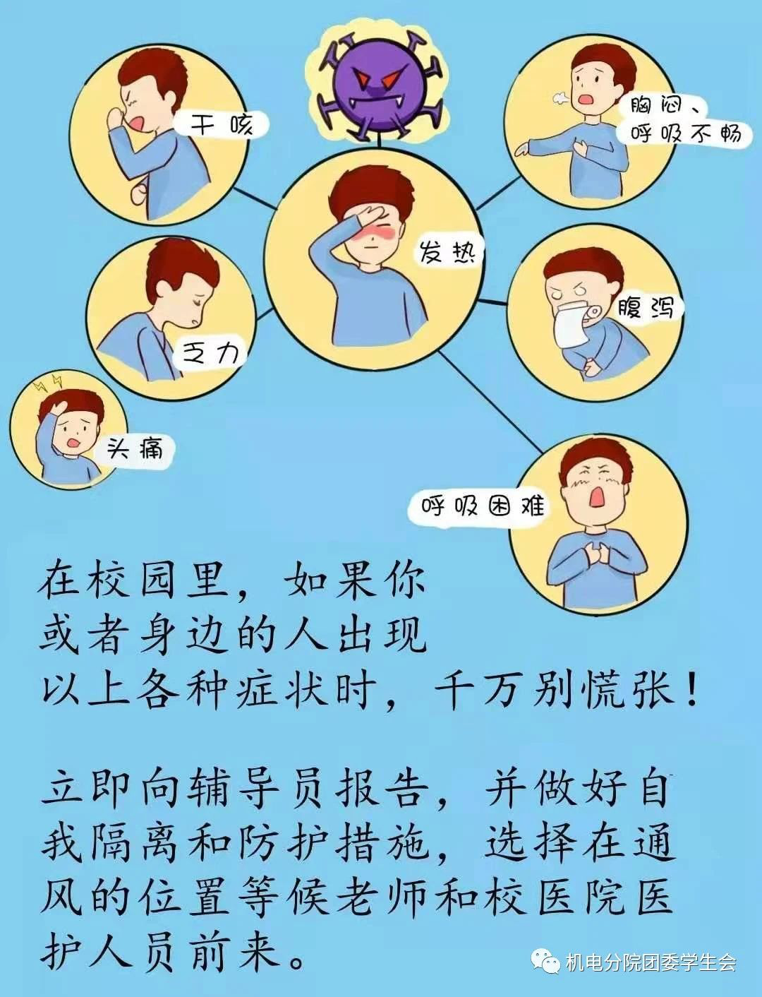 科學(xué)處置異常狀況。一旦出現(xiàn)發(fā)熱、咳嗽等可疑癥狀,先不要驚慌,應(yīng)立刻向校醫(yī)院工作人員和輔導(dǎo)員報(bào)告具體情況,并保持原地隔離狀態(tài),等待學(xué)校工作人員到現(xiàn)場(chǎng)按照流程科學(xué)處置。