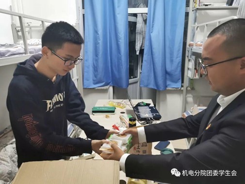 走訪活動(dòng)在機(jī)電工程學(xué)院團(tuán)委書(shū)記趙寶剛老師的帶領(lǐng)下進(jìn)行。走訪中,學(xué)生黨員與積極分子干部給大一新生送上趙寶剛老師為同學(xué)們準(zhǔn)備的中秋月餅,并送去中秋慰問(wèn)。