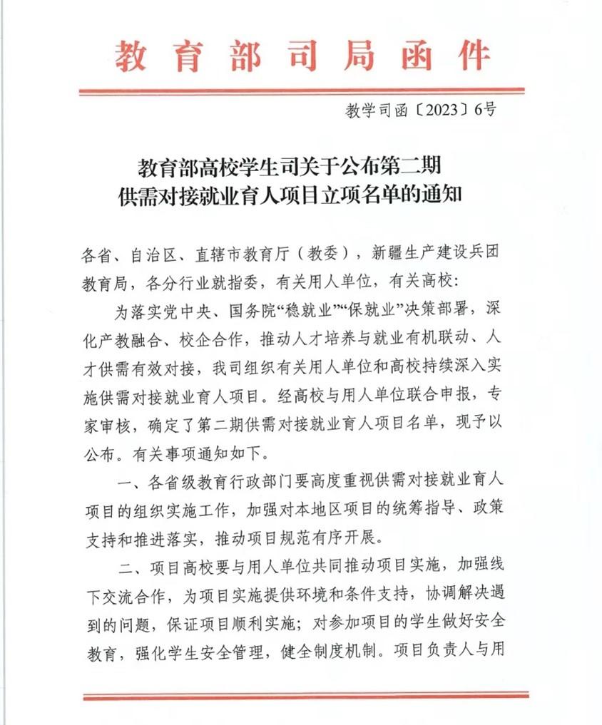 2023年4月6日,教育部高校學(xué)生司發(fā)布《關(guān)于公布第二期供需對(duì)接就業(yè)育人項(xiàng)目立項(xiàng)名單的通知》(教育司函〔2023〕6號(hào))。供需對(duì)接就業(yè)育人項(xiàng)目是教育部高校學(xué)生司為落實(shí)黨中央、國(guó)務(wù)院“穩(wěn)就業(yè)”“保就業(yè)”決策部署,深化產(chǎn)教融合、校企合作,推動(dòng)人才培養(yǎng)與就業(yè)有機(jī)聯(lián)動(dòng)、人才供需有效對(duì)接的育人項(xiàng)目。長(zhǎng)春電子科技學(xué)院6個(gè)項(xiàng)目獲批立項(xiàng),其中機(jī)電工程學(xué)院獲批4個(gè)項(xiàng)目。此次獲批的就業(yè)育人項(xiàng)目涵蓋定向人才培養(yǎng)培訓(xùn)項(xiàng)目和人力資源提升項(xiàng)目2類,合作企業(yè)包括京東方科技集團(tuán)股份有限公司、北京華航唯實(shí)機(jī)器人科技股份有限公司、北京炎凌嘉業(yè)機(jī)電設(shè)備有限公司、北京云道智造科技有限公司4家頭部大型企業(yè)。