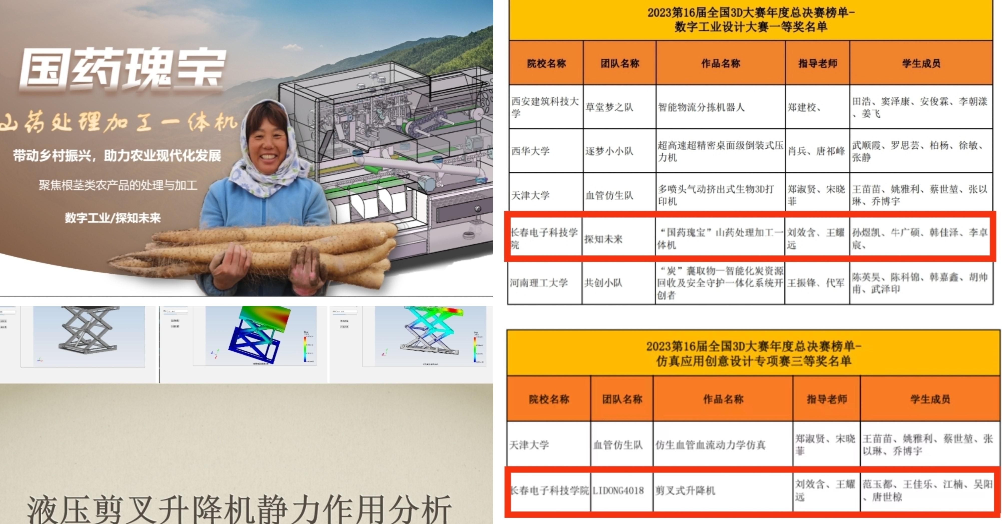 機(jī)電工程學(xué)院師生合作、攜手構(gòu)思,做到學(xué)以致用。以自身的創(chuàng)意結(jié)合專業(yè)知識(shí),對于產(chǎn)品進(jìn)行設(shè)計(jì)建模、仿真分析,憑借扎實(shí)的專業(yè)素養(yǎng)以及出色的作品展示,創(chuàng)下可喜可賀的佳績。由劉效含等老師指導(dǎo)的作品“‘國藥瑰寶’山藥處理加工一體機(jī)”在數(shù)字工業(yè)設(shè)計(jì)大賽斬獲全國一等獎(jiǎng),這也是我校在該項(xiàng)賽事取得的最高獎(jiǎng)項(xiàng),該獎(jiǎng)項(xiàng)的獲得是對我校參賽團(tuán)隊(duì)在設(shè)計(jì)創(chuàng)意、機(jī)械制造、三維仿真等方面實(shí)力的肯定,也是對我校推動(dòng)創(chuàng)新教育的認(rèn)可,突出了我校在數(shù)字化設(shè)計(jì)的卓越能力;作品“剪叉式升降機(jī)”在“仿真應(yīng)用創(chuàng)意設(shè)計(jì)專項(xiàng)賽”獲得三等獎(jiǎng)。