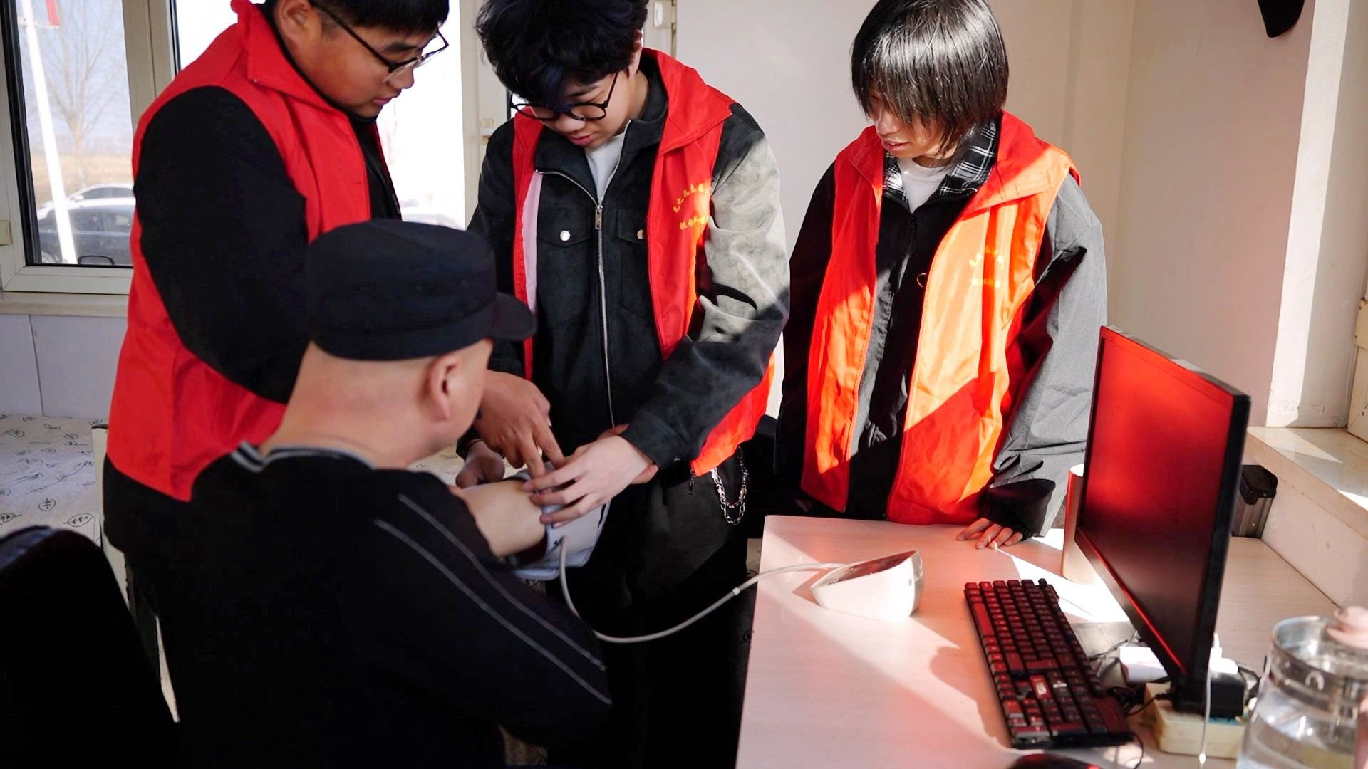 活動現(xiàn)場,志愿者們身著統(tǒng)一服裝,攜帶血壓計、血糖儀等設(shè)備,為食堂工作人員、校園保安、宿管阿姨等后勤人員測量血壓血糖,并耐心解答健康疑問。針對不同崗位工作特點,志愿者們還普及了春季常見病預(yù)防知識,倡導(dǎo)合理飲食與適度運動。面對后勤師傅們的咨詢,志愿者們逐一耐心解答,用真誠和熱忱傳遞青春溫度。讓默默奉獻(xiàn)的校園守護(hù)者們感受到來自學(xué)院的關(guān)懷。