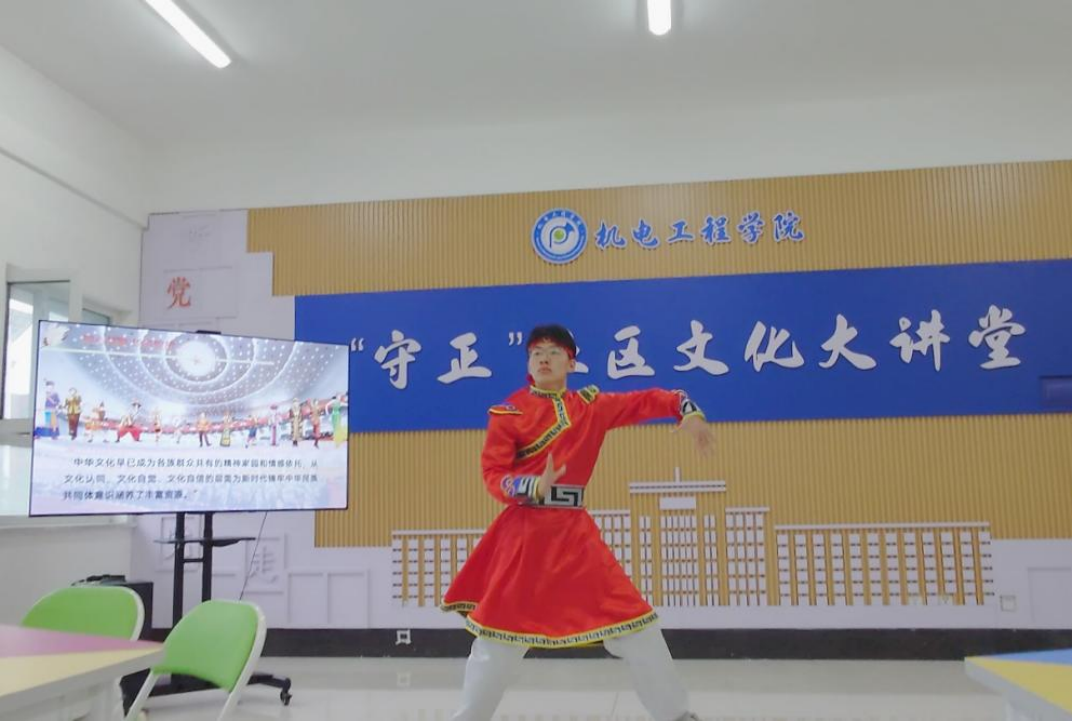 ▲機(jī)械設(shè)計(jì)制造及其自動(dòng)化專業(yè)5班趙昊然展示蒙古族舞蹈