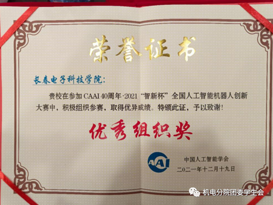 “創(chuàng)新推動(dòng)發(fā)展,科技引領(lǐng)未來。”在院領(lǐng)導(dǎo)的高度重視下,機(jī)電工程學(xué)院的學(xué)生積極踴躍的報(bào)名參加了“智新杯”(智能創(chuàng)新杯)2021全國(guó)人工智能機(jī)器人創(chuàng)新大賽的比賽。本次大賽由中國(guó)人工智能學(xué)會(huì)主辦,CAAI人工智能基礎(chǔ)專委會(huì)、CAAI教育工委會(huì)、國(guó)際信息研究學(xué)會(huì)中國(guó)分會(huì)人工智能專委會(huì)聯(lián)合承辦,并于2021年11月27日順利舉行。