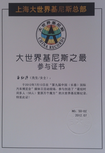 我院大二學(xué)生,魔方協(xié)會(huì)會(huì)長(zhǎng)王紅陽(yáng)同學(xué)在7月份長(zhǎng)春國(guó)際汽車博覽會(huì)上,與大家一起創(chuàng)造了大世界基尼斯“最短時(shí)間多人復(fù)原萬(wàn)個(gè)魔方”的世界紀(jì)錄。