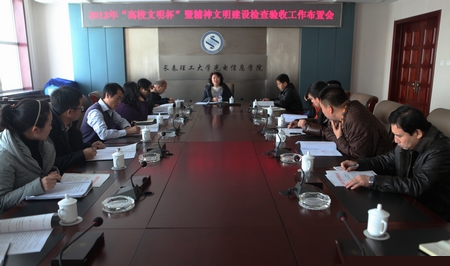 陳藝副書記在會上對我院迎接精神文明建設(shè)檢查工作做了強(qiáng)調(diào),她指出,“高校文明杯”競賽是長春市高校工委組織的在長高校之間的競賽活動,是長春市創(chuàng)建全國文明城市“十杯賽”活動之一,學(xué)院領(lǐng)導(dǎo)對此次活動高度重視,希望與會同志提高認(rèn)識、認(rèn)真落實(shí)工作任務(wù),做好迎檢材料的上報(bào)工作,將我院一年來開展的精神文明建設(shè)工作能夠充分地展示出來,并通過此項(xiàng)活動提升學(xué)院的知名度,爭取在精神文明建設(shè)工作檢查中取得好的成績。