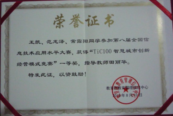 日前,我院信息工程分院傳來(lái)好消息,由我院信息工程分院田麗華老師帶隊(duì),范龍澤、常露陽(yáng)和王凱三名同學(xué)組成的代表隊(duì)在2013 TiC100智慧城市與物聯(lián)網(wǎng)創(chuàng)新經(jīng)營(yíng)模式競(jìng)賽中獲得中國(guó)電信專場(chǎng)一等獎(jiǎng)。