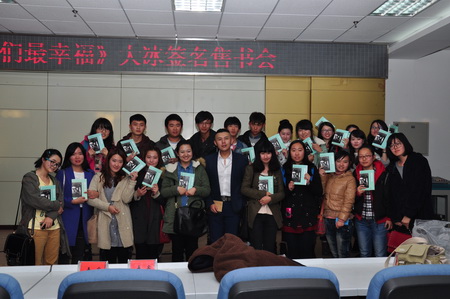 2013年10月30日,山東電視臺首席主持人大冰,攜其新作《他們最幸?!飞W臨我院。下午兩點,在南校區(qū)14樓報告廳,大冰舉行了簽售活動。學院副院長王思迪受邀出席了簽售活動,院長辦公室副主任蔡超、院辦新聞中心主任李琢、學生處學生管理科科長張燁等老師參加了活動。此外,還有各分院的同學們和從遠道而來的其他高校的同學。