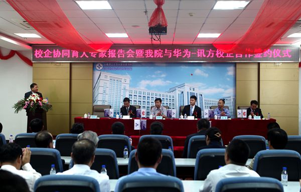 簽字儀式后,王思迪先生、劉君義教授、姚勇先生、李學(xué)成先生、鞠殿民院長共同按下儀式啟動(dòng)球。隨后,華為公司的領(lǐng)導(dǎo)作了以“產(chǎn)學(xué)研融合創(chuàng)新人才培養(yǎng)合作思路”為主題的“云計(jì)算”報(bào)告,訊方公司領(lǐng)導(dǎo)作了“產(chǎn)教融合創(chuàng)新人才培養(yǎng)合作思路”報(bào)告。據(jù)了解,今后光電信息學(xué)院通信工程、網(wǎng)絡(luò)工程技術(shù)方向、物聯(lián)網(wǎng)工程等專業(yè)的學(xué)生將獲益頗多。“華為信息與網(wǎng)絡(luò)技術(shù)學(xué)院”的成立也將為電子通信行業(yè)培養(yǎng)更多優(yōu)秀專業(yè)人才。
