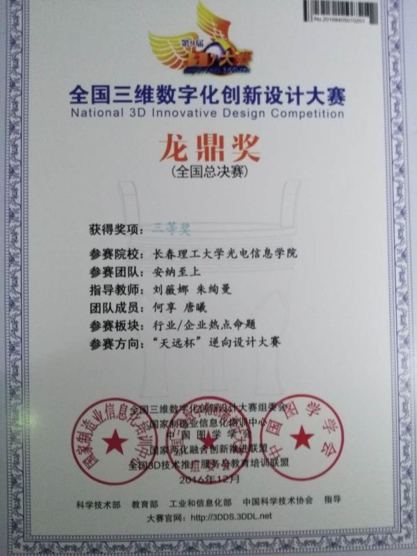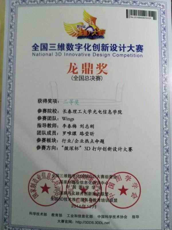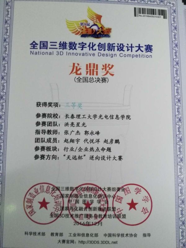 第9屆全國3D大賽總決賽于2016年12月9日至12日在江蘇省常州市盛大舉辦。長春理工大學(xué)光電信息學(xué)院機電工程分院共有3支代表隊分別在“天遠杯”逆向設(shè)計賽項、“微深杯”3D打印創(chuàng)新設(shè)計賽項中取得優(yōu)異成績,斬獲國家級二等獎1項,國家級三等獎2項。