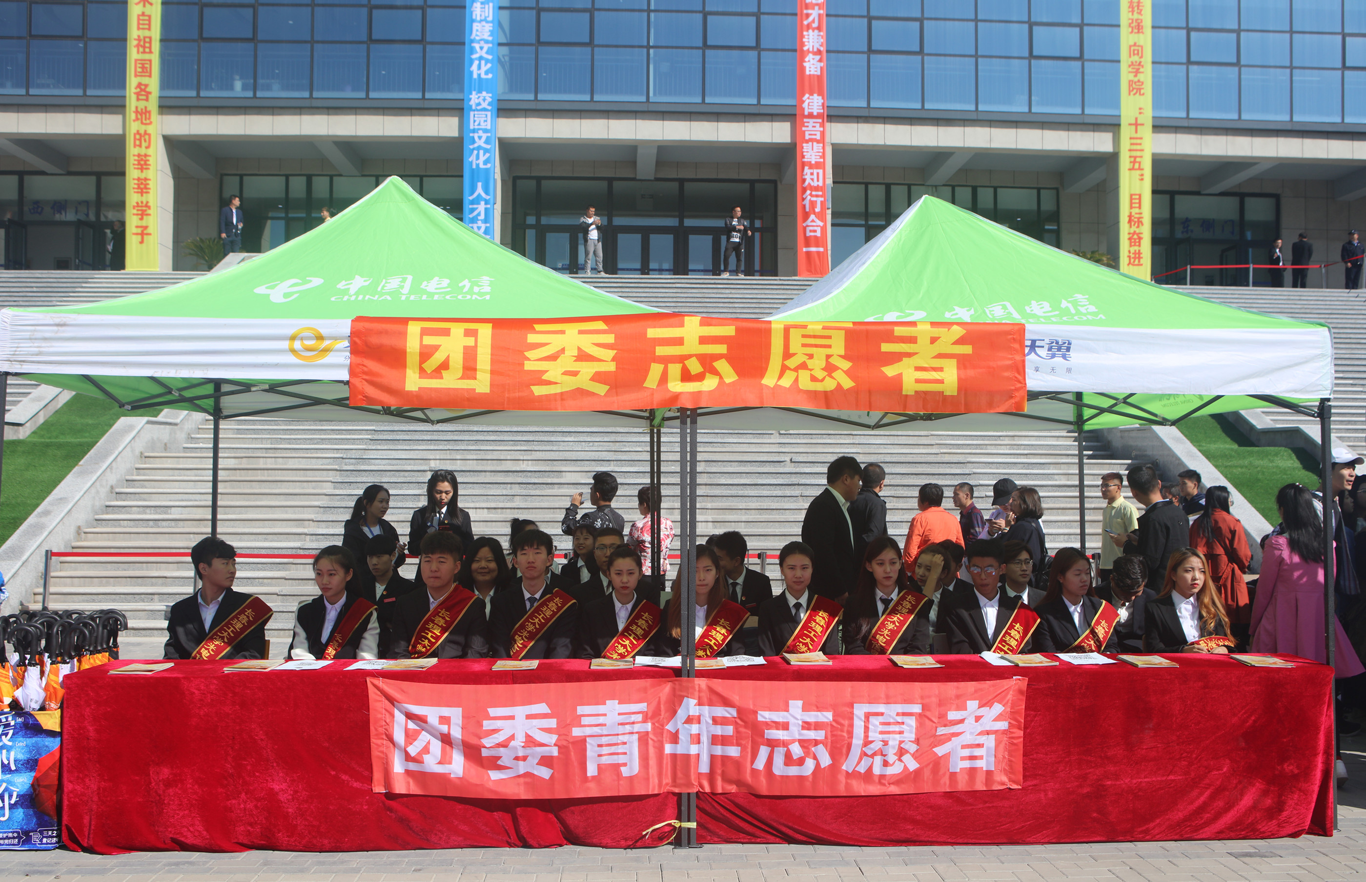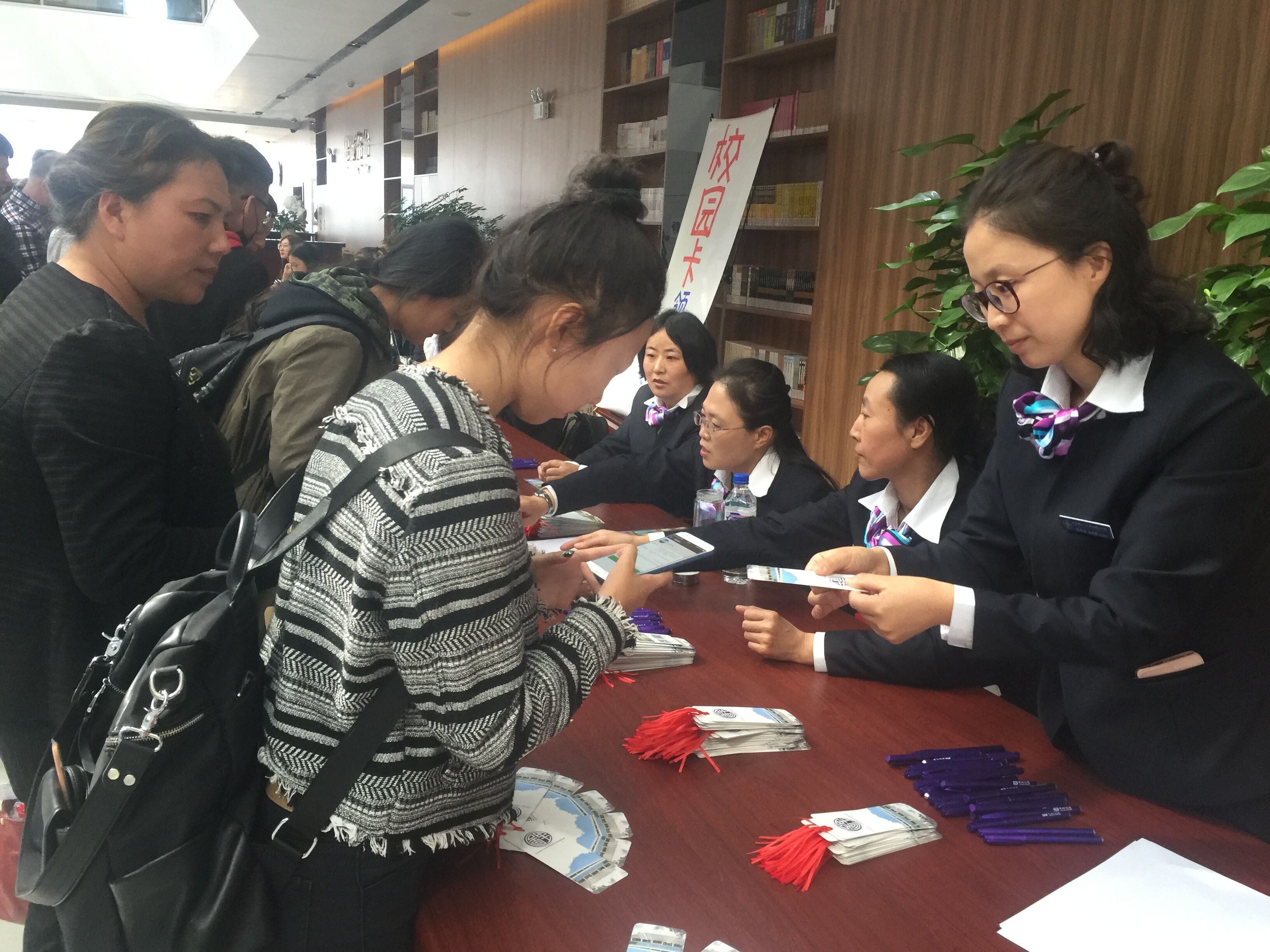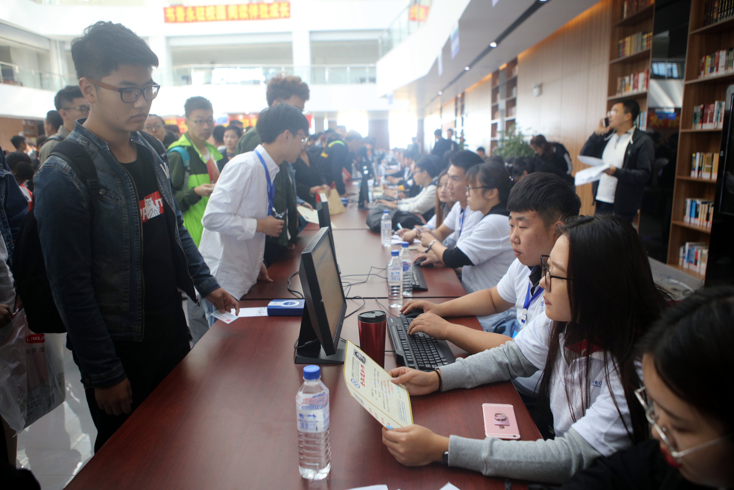 在報到現(xiàn)場,參與本次迎新工作的各單位、部門在各自的迎新窗口緊張調(diào)試機(jī)器,細(xì)致培訓(xùn)相關(guān)業(yè)務(wù),認(rèn)真演示報到流程。此外,宣傳展板、拱門、飄球、條幅等將陸續(xù)就位。院長辦公室提前發(fā)放了迎新工作人員的工作裝、礦泉水。院團(tuán)委組織志愿者學(xué)生參與迎新的接待工作。各贊助單位的展位布置工作也在緊鑼密鼓地進(jìn)行當(dāng)中。