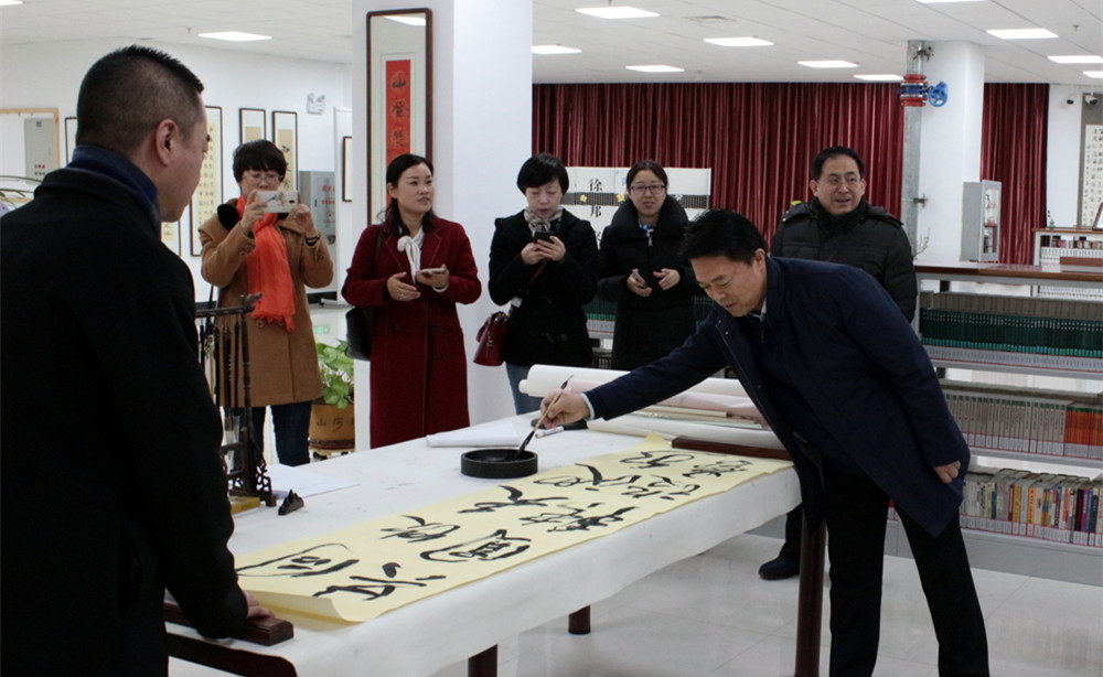 訪問團(tuán)一行首先參觀了我院圖書館,充分感受了我院省級(jí)“書香大學(xué)示范基地”建設(shè)的成果。在圖書館四樓邦家書藝苑,訪問團(tuán)一行受到了學(xué)院董事陳洪秋女士和我院特聘教授徐邦家先生的親切接見,各位領(lǐng)導(dǎo)與訪問團(tuán)親切合影留念。李健書記即興為我院留下墨寶,寫下“同飲天池水、共圓轉(zhuǎn)設(shè)夢”的美好祝愿。訪問團(tuán)在圖書館參觀期間,陳茜館長全程陪同接待。