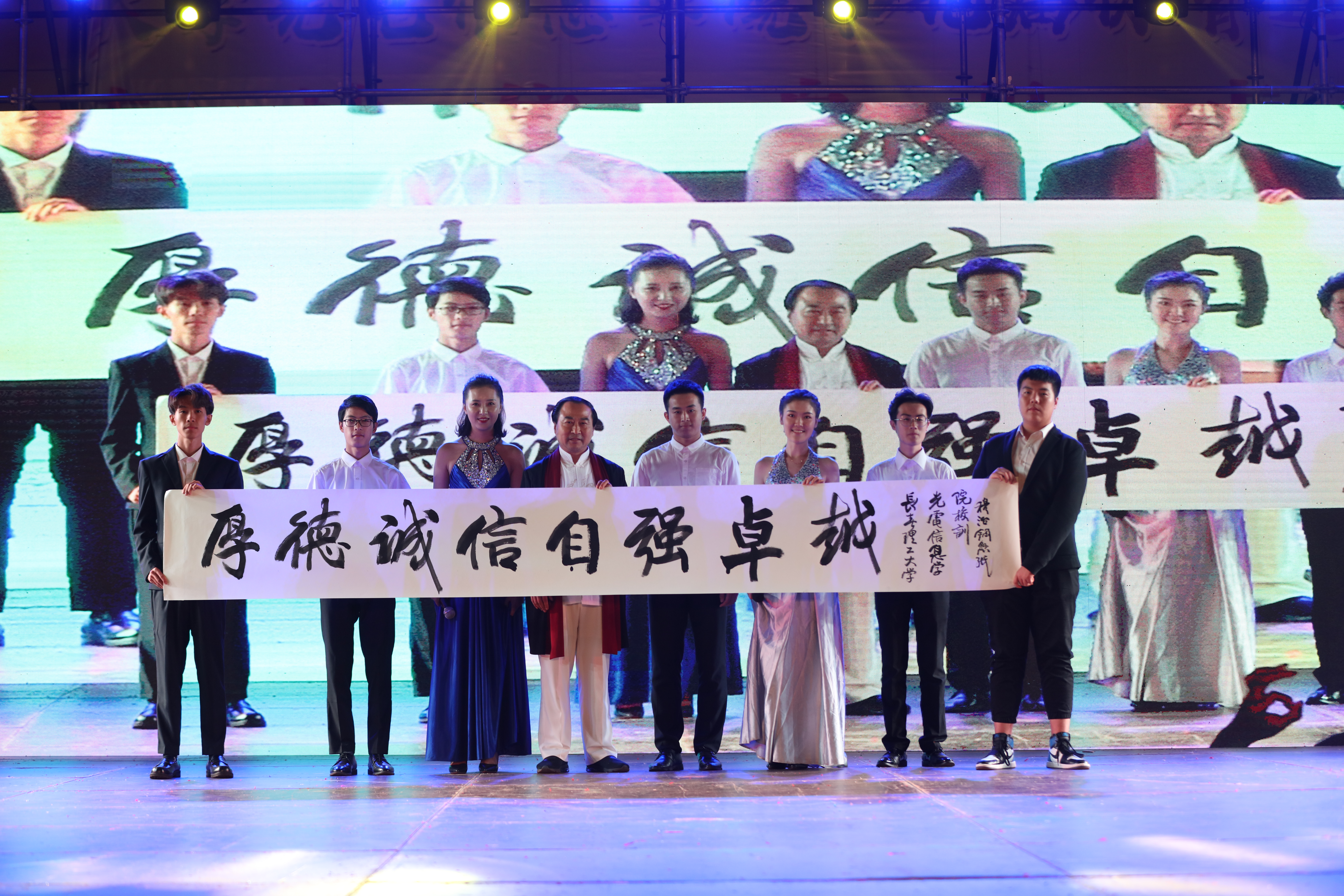 晚會的亮點之一是學(xué)院董事長、院長王思迪與藝術(shù)團(tuán)舞蹈部、宋鎮(zhèn)等同學(xué)合唱的《今天》、《光輝歲月》以及全國著名書法家、上海懸紙書法研究院院長穆治鋼現(xiàn)場揮毫獻(xiàn)墨,他為學(xué)院獻(xiàn)上了“厚德 誠信 自強(qiáng) 卓越”八字校訓(xùn)的書法作品。