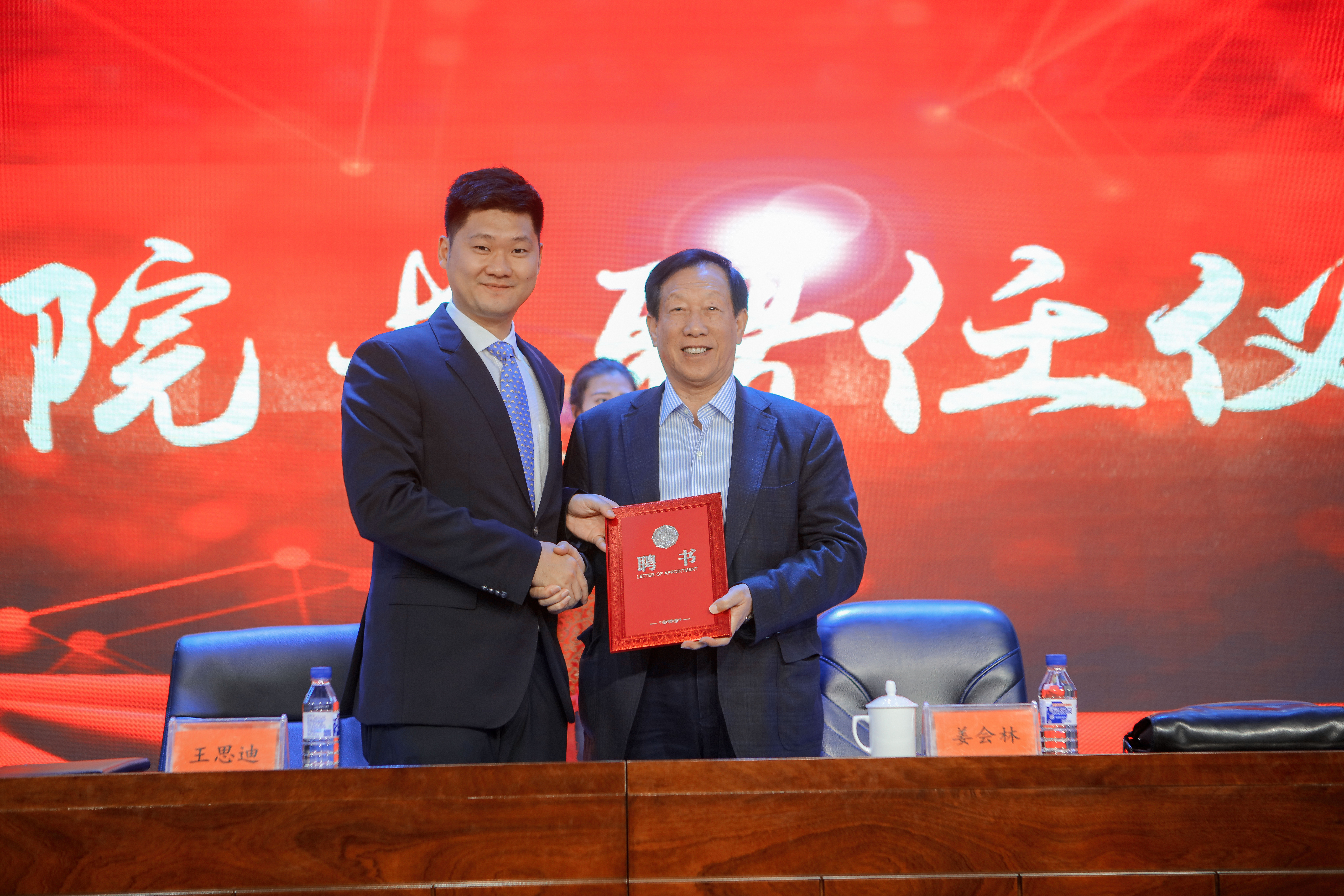 聘任儀式上,學(xué)院董事長(zhǎng)、院長(zhǎng)王思迪親自將名譽(yù)院長(zhǎng)聘書頒發(fā)給姜會(huì)林院士,并合影留念。