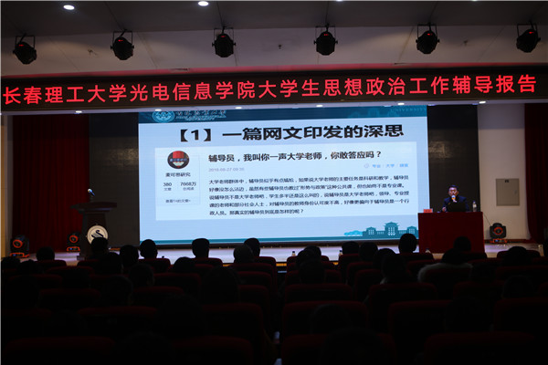 為了進(jìn)一步加強和改進(jìn)我院大學(xué)生思想政治教育工作,辦好中國特色社會主義大學(xué),切實服務(wù)學(xué)生全面成長成才。2018年11月1日,由學(xué)院黨委宣傳部主辦的“做好高校思想政治工作輔導(dǎo)報告”在圖書館報告廳舉行。