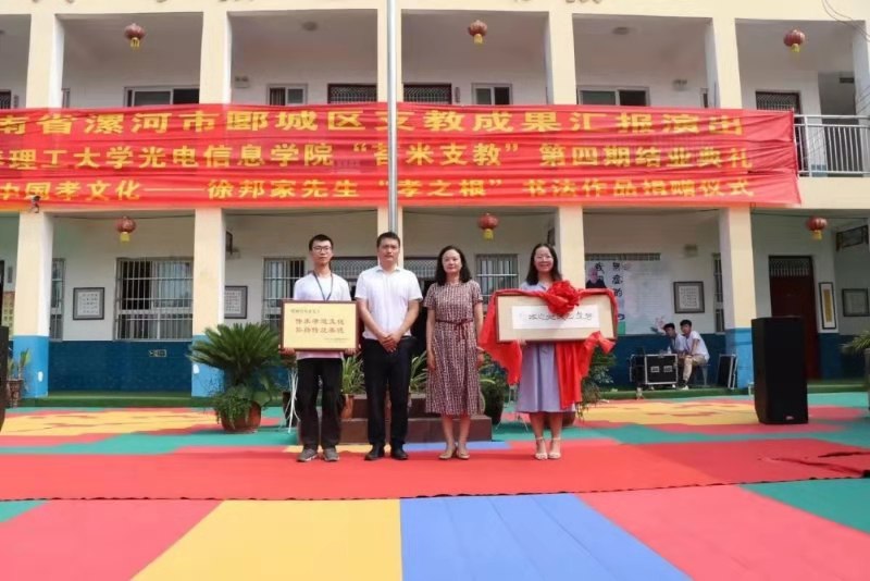 8月9日,郾城區(qū)教育局舉辦了傳播中國優(yōu)秀文化—徐邦家先生“孝之根”書法作品捐贈儀式,郾城區(qū)于宏副區(qū)長、關工委王順華主任,教育局李克明局長、新店鎮(zhèn)黨委臧超書記、長春理工大學光電信息學院黨委宣傳部部長范爽、校團委書記鞠秀晶、董事長辦公室副主任宋濤等出席。