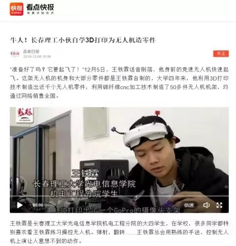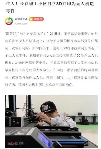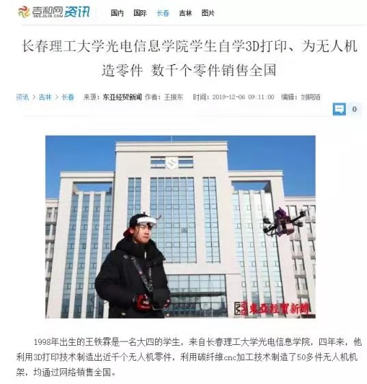 1998 年出生的王鐵霖是我院機電工程分院一名大四的學(xué)生,四年來,他利用3D打印技術(shù)制造出近千個無人機零件,利用碳纖維cnc加工技術(shù)制造了50多件無人機機架,均通過網(wǎng)絡(luò)銷售到全國各地。