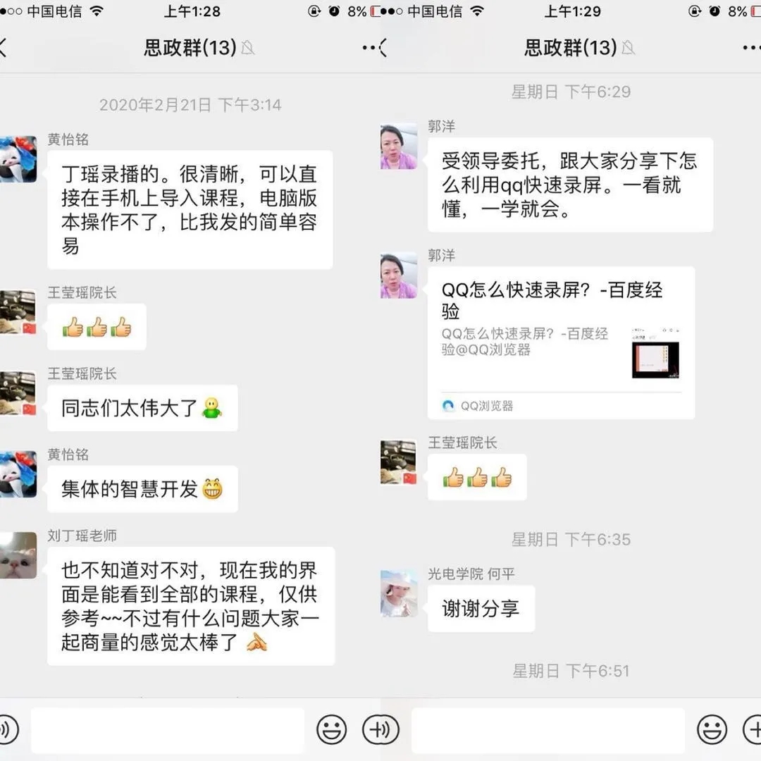 課程結(jié)束后,老師們紛紛交流線上教學(xué)的經(jīng)驗(yàn)和遇到的問題,填寫“線上教學(xué)運(yùn)行情況反饋統(tǒng)計(jì)表”,為其他老師提供實(shí)踐方法和經(jīng)驗(yàn)。同學(xué)們也爭相瀏覽、交流平臺(tái)上的優(yōu)質(zhì)教學(xué)資源,大家真正做到了認(rèn)真地“學(xué)”、深入地“思”和自覺地“行”。