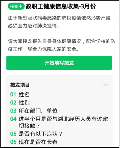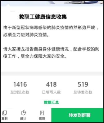 實(shí)現(xiàn)線上統(tǒng)計(jì)職工健康情況并按要求完成日?qǐng)?bào)告。人事處聯(lián)合現(xiàn)代教育技術(shù)中心第一時(shí)間開(kāi)發(fā)“教職工健康收集”小程序,實(shí)現(xiàn)了全體教職工線上每日匯報(bào)健康情況、疫情狀況、返長(zhǎng)情況等;按要求完成疫情“零報(bào)告、日?qǐng)?bào)告”工作。