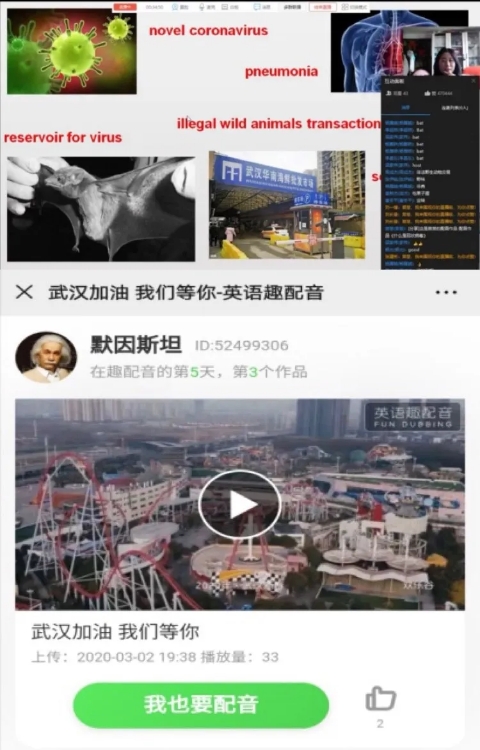 首先在每堂課的教學(xué)內(nèi)容上,我額外增加了疫情高頻詞匯這個(gè)版塊,每節(jié)課我會(huì)結(jié)合疫情新聞并配以圖片,為同學(xué)們介紹5-6個(gè)有關(guān)疫情的高頻詞匯,并在第一周的周末讓學(xué)生利用英語(yǔ)趣配音APP任選一部針對(duì)此次疫情的科普短片進(jìn)行配音,并分享至釘釘群,供同學(xué)查閱評(píng)論,從而達(dá)到練習(xí)口語(yǔ)的教學(xué)目標(biāo)。