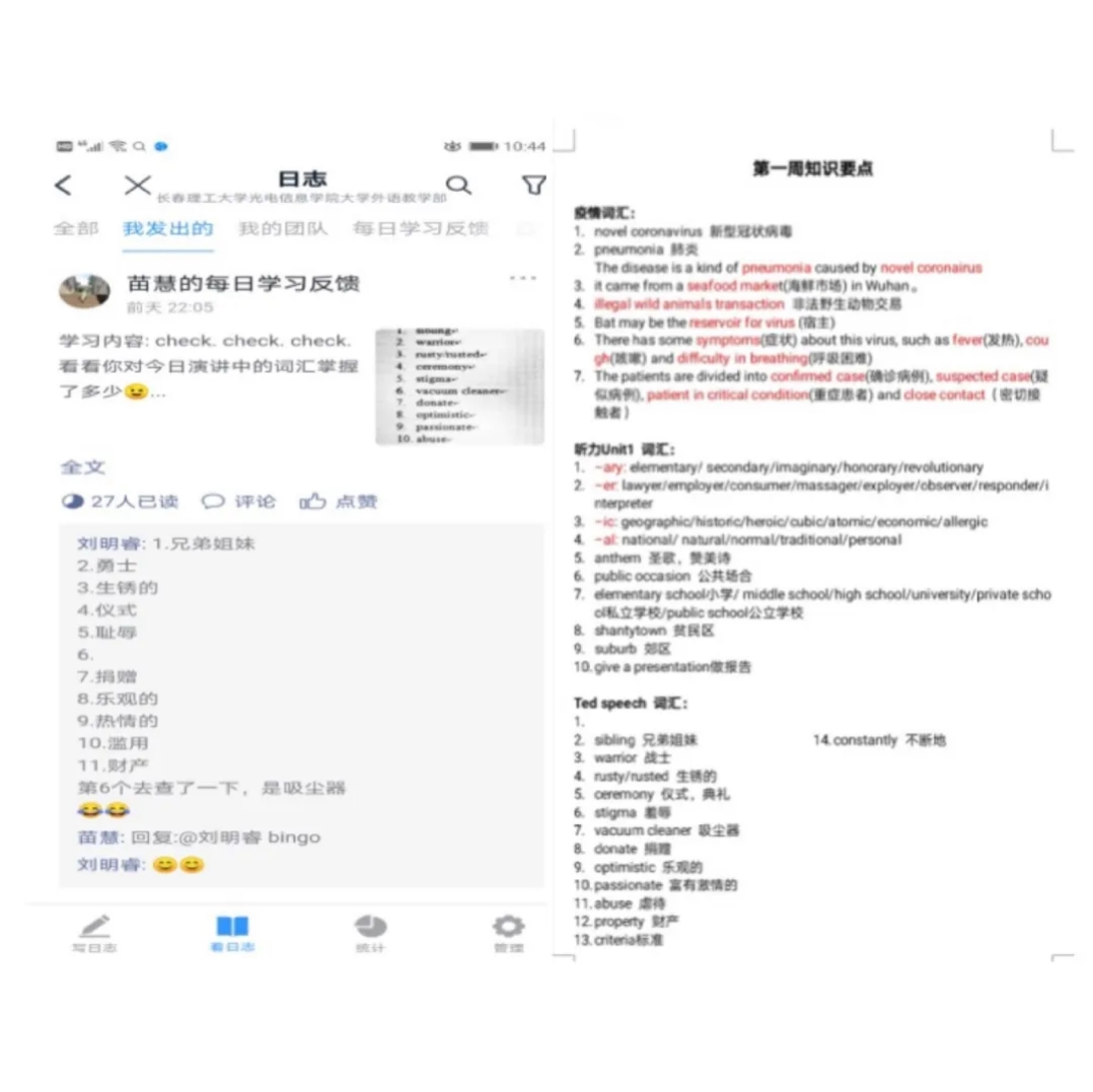最后考慮到線上授課,同學(xué)可能會(huì)出現(xiàn)信號(hào)卡頓,知識(shí)點(diǎn)掌握不精準(zhǔn)等情況。我會(huì)在一周課程結(jié)束后,將本周的知識(shí)點(diǎn)進(jìn)行總結(jié),發(fā)布給同學(xué)供他們用于鞏固溫習(xí)。在第一周的課程結(jié)束會(huì),我也與各班課代表集體進(jìn)行了語(yǔ)音會(huì)議,及時(shí)了解各班對(duì)晚上授課的進(jìn)度或節(jié)奏是否滿意,同學(xué)是否有困難或建議。同學(xué)反映都跟的上,有的同學(xué)甚至很喜歡英語(yǔ)配音這樣的口語(yǔ)練習(xí)方式。