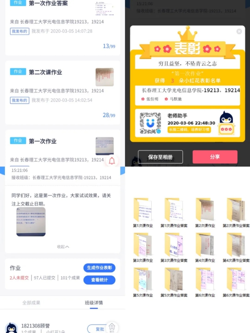 后來,學(xué)生們給我推薦了QQ小程序“老師助手”,看到同學(xué)們手寫拍照上傳的作業(yè),我懸著的心終于放下來了,我可以通過每節(jié)課留作業(yè)的方式,督促學(xué)生們完成當(dāng)日的學(xué)習(xí)任務(wù),再利用這個(gè)小程序進(jìn)行批改、公布答案、給學(xué)生們發(fā)小紅花、點(diǎn)贊等,吸引同學(xué)們關(guān)注,并考察他們的學(xué)習(xí)情況。