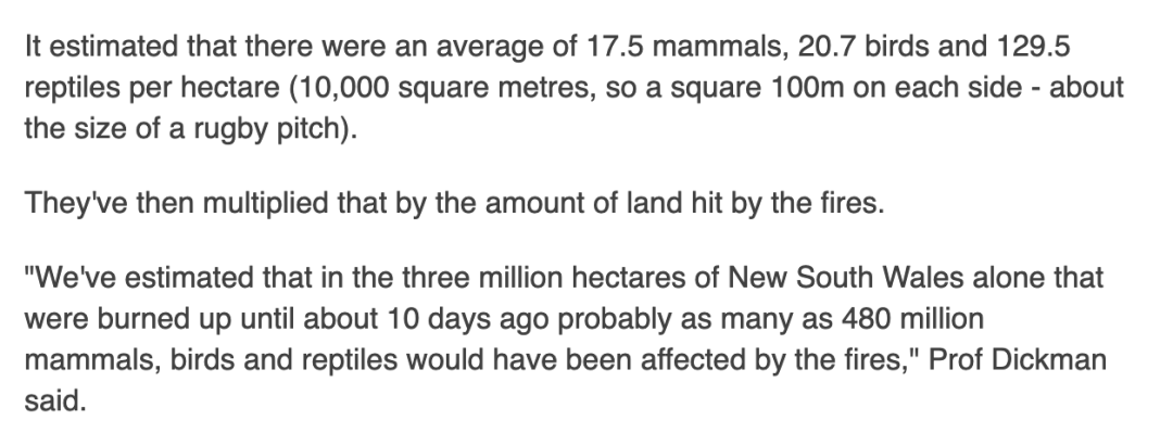 然而,面對(duì)這一切,有一組數(shù)據(jù)還是需要大家知道。在澳洲300萬(wàn)的山火面積上,目前已經(jīng)有:5200萬(wàn)的哺乳動(dòng)物,6200萬(wàn)的鳥(niǎo)類(lèi),3.89億的爬行動(dòng)物,在這場(chǎng)大火中喪生!
