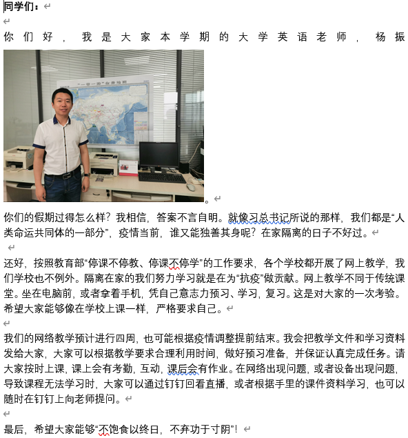 新冠肺炎疫情爆發(fā)以來,在教育部提出的“停課不停教、停課不停學”的指導思想下,各級各類學校開展了形式各樣的在線教學。本人所在的大學外語教學部采用釘釘平臺直播的方式進行網絡授課,轉眼之間已有一個月的時間,我們也從最開始的懵懂緊張到現在的熟悉接受,并在不斷地精進創(chuàng)新。這一個月的在線教學帶給我了很多啟發(fā)和感受,它讓我由關注老師 “教什么”到學生“學什么”,由“如何教”到“如何學”,由“教了什么”到“學了什么”。