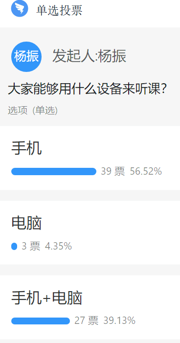 “全程直播的網絡課堂,如果操作不當,可能會變成‘廣播’”。不是我說的,這是南京大學王海嘯教授在進行“利用釘釘視頻直播+SPOC平臺實施遠程在線教學”講座時說的。意思就是,你自己在那里講,學生可能在屏幕前面做各種事情,就像把你的課程當成了 “廣播背景音”一樣。為了避免這種現象的發(fā)生,一是減少直播在課堂中所占比例;另一點就是在直播的時候,使用一些小技巧。我會根據課堂節(jié)奏,結合釘釘軟件功能,設定一些小互動、小問題,小投票。隨時監(jiān)測學生的聽課狀況,了解學生對知識的掌握情況。