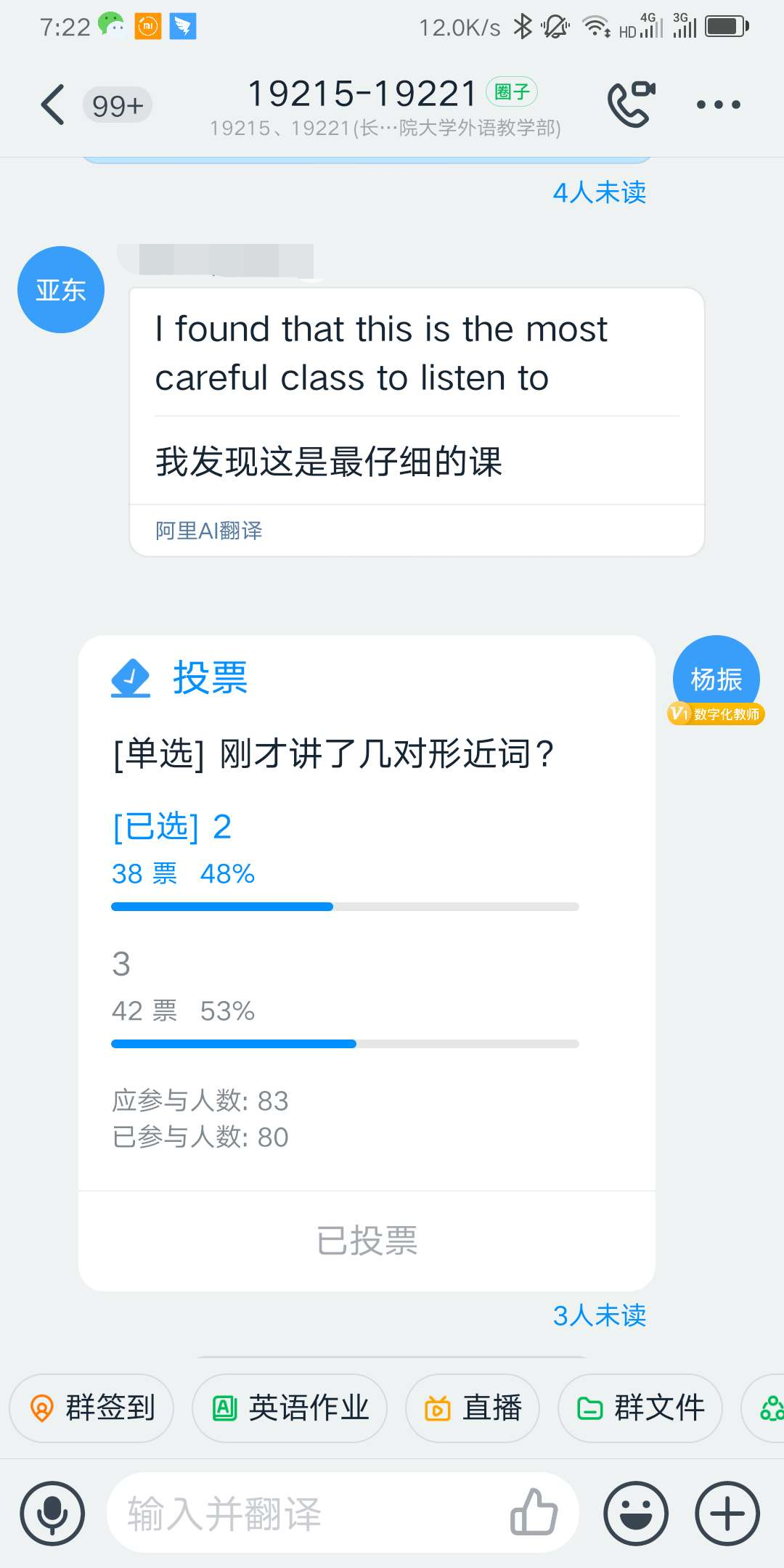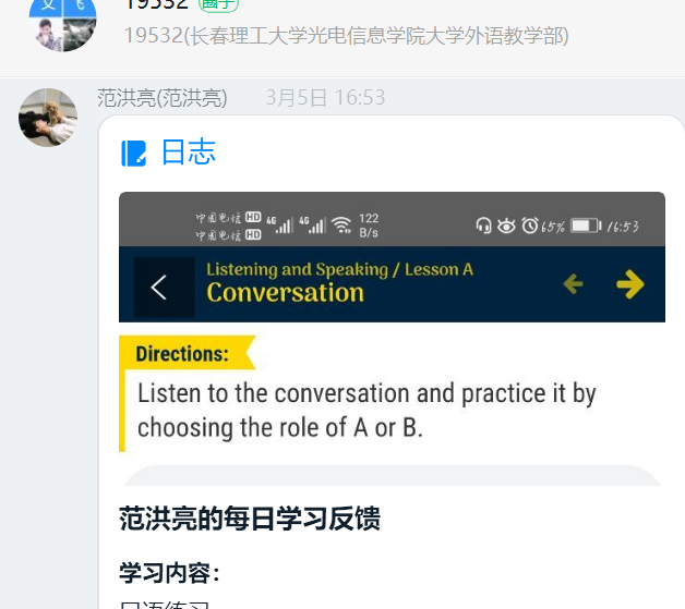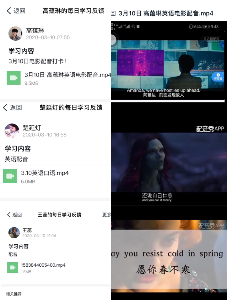 同時為了鍛煉學生的口語能力在每日學習反饋中我為他們布置了英文電影配音的任務,不僅調動了大家的積極性,口語方面也得到了很大的鍛煉。同時在學習反饋提交時也會安排四六級聽力打卡和詞匯內容。在每周末,我會根據學生們提交的釘釘反饋情況進行總結,將精要部分提取并發(fā)到群中,以便學生復習使用。也會在QQ群中為同學們進行答疑。
