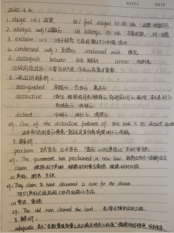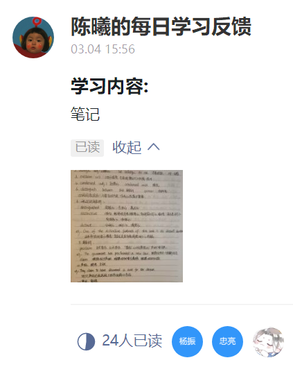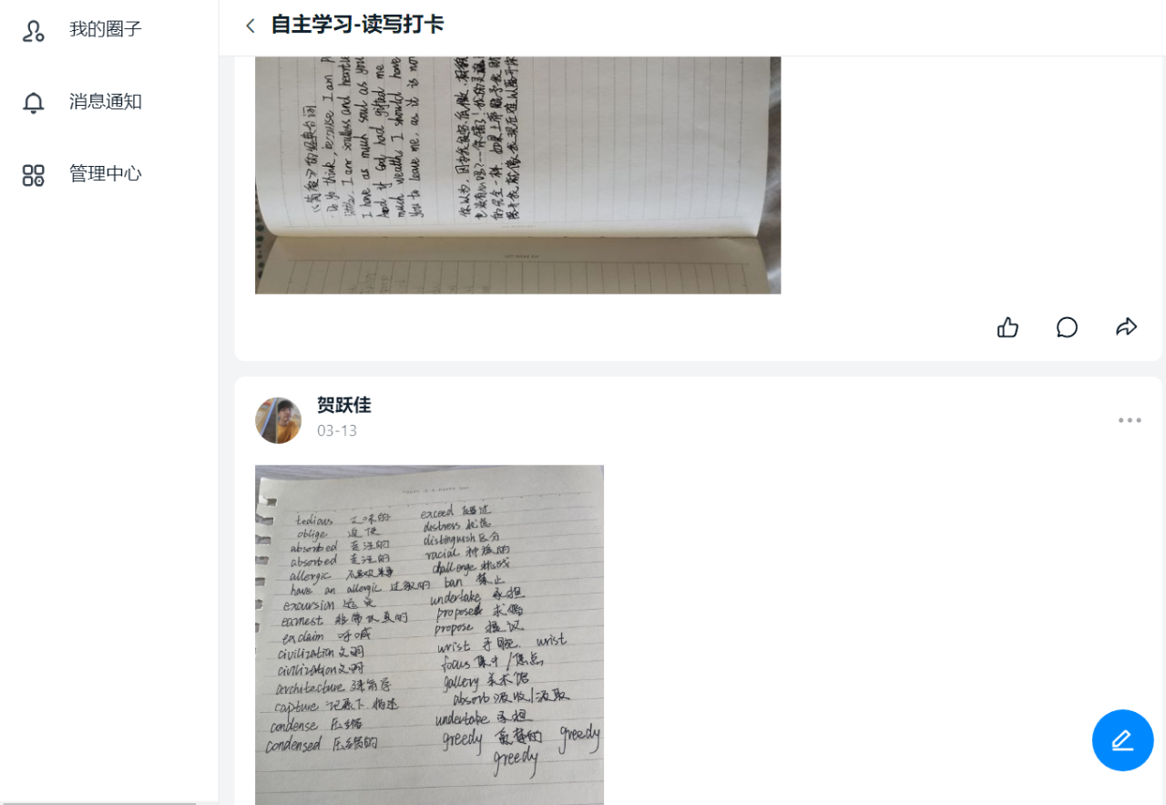 當然,大學英語課老師的“小皮鞭”不止課上揮舞,課下也有“余威”。每位同學要把當天當堂課的筆記拍照上傳。