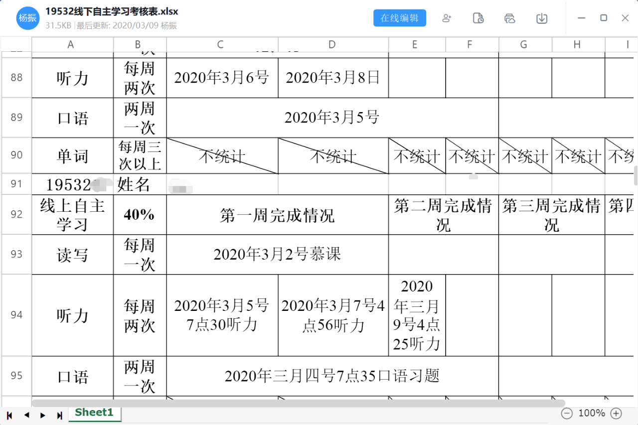 除此之外,為了確保學生能夠盡可能多地獲取知識,結合部門的指導文件,我制作了一張Excel表格,上傳到班級釘釘群中,讓同學們在完成任務后,到群中去“在線編輯”(這個功能便于學生填報,也方便教師整理),——擅于總結,才會有積累。