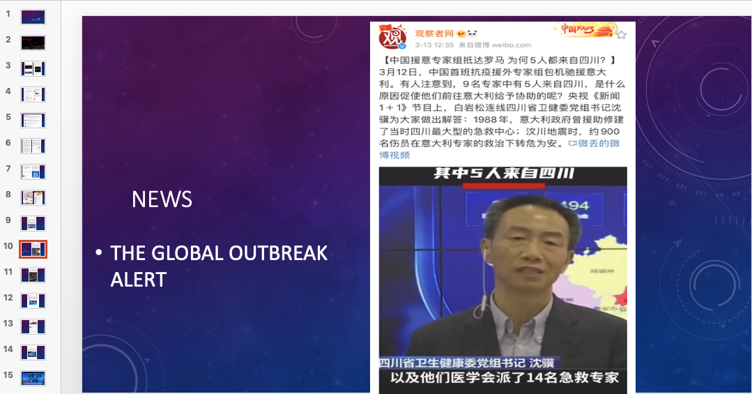 首先我希望的是孩子們不要只讀圣賢書,要了解窗外事。因為本學期的課程也正是跨文化交際,所以每堂課前我會為同學們英文介紹最新的實時疫情狀況,以及一些國際新聞,播放一些相關視頻,目的是為了讓同學們樹立一個正確的三觀??梢杂糜⒄Z來講述中國人自己的故事,真正的做到溝通的橋梁的作用。