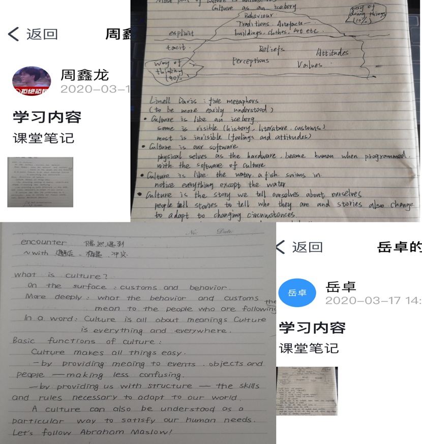 這段時間的在線教學帶給我更多的是收獲,收獲了教學技能的提升,在線教學平臺的使用,教學模式的創(chuàng)新,更收獲了學生的包容、支持與鼓勵。雖然是在線教學,不能與學生面面對互動,但學生在線課堂的積極參與、課堂筆記的認真書寫、口語視頻的精心制作、MOOC學習的認真完成、每日學習反饋的全員提交等,給了我莫大的感動與激勵,正是我可愛的學生們認真的態(tài)度鼓勵著我不斷改進教學,給他們的學習帶來更多的收獲。疫情期間的在線教學雖是不得已的行為,但這種教學模式卻為我們的傳統(tǒng)英語教學帶來了創(chuàng)新,希望疫情之后我們能更科學、合理地融合這兩種教學方式,助力英語教學。