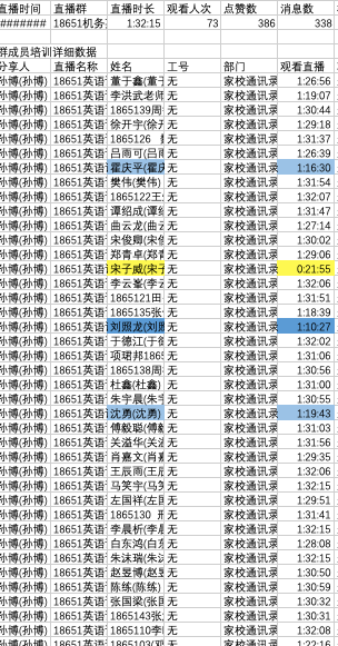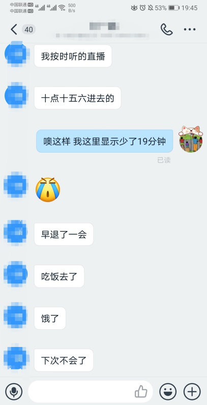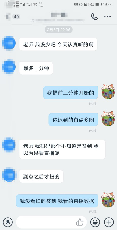 釘釘和騰訊課堂在直播課后都有數據統(tǒng)計,每個學生的聽課時長都能看到,這樣就清晰可見是都有人曠課。每節(jié)課后我都會檢查,考慮到不同地區(qū)網絡狀況不同,時長少一兩分鐘很正常,但是如果有時長較短的,我會去詢問原因,并做記錄,嚴重者將予以警告。