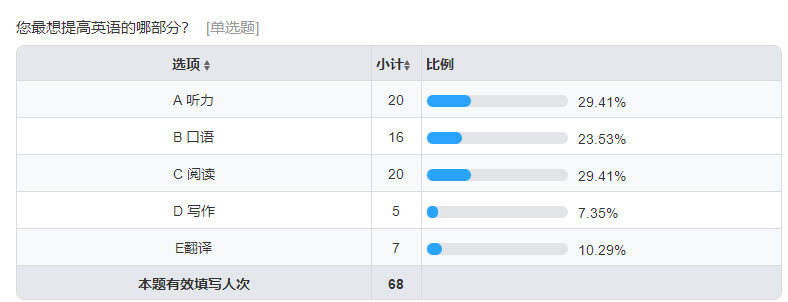 本學期的兩個教學班19432和19521均為新接手的班級,這對我的在線教學帶來了很大的挑戰(zhàn)。因為與學生素未謀面,未能掌握學生的基本情況,擔心會對接下來的在線教學帶來困難。在一周的教學之后,我開展了基于問卷星的“大學英語在線教學問卷調查”,就學生的學習需求、英語學習存在的問題、網絡自主學習習慣、在線學習內容、在線學習優(yōu)缺點、在線教學效果、在線學習建議等做了基本調查,掌握了學生的基本信息,從而有利于下一步的精準教學。了解到學生在英語聽力、閱讀、口語方面有較大的學習需求,接下來的教學中我將側重于此方面的教學。